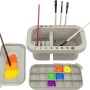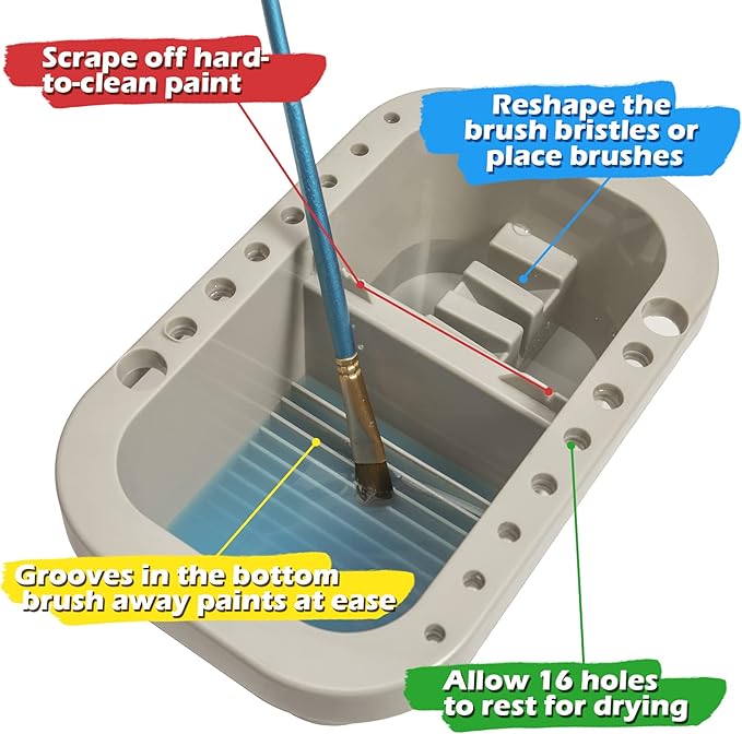 - Paint brush cleaner features a lid, a paint palette and a brush wash basin for water and mixing